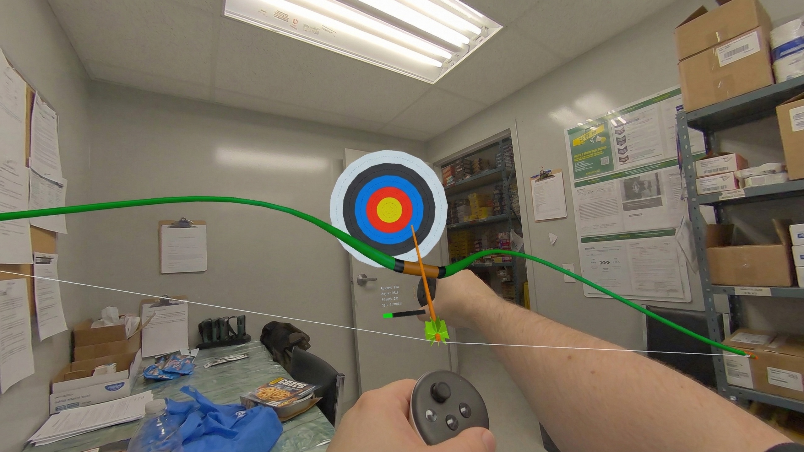 Controls: Grip spawns your bow; the trigger spawns your arrows. To fire an arrow, move your hands apart to reach for one, pull trigger, then bring your hands together to nock. Pull back and release the trigger to take your shot.